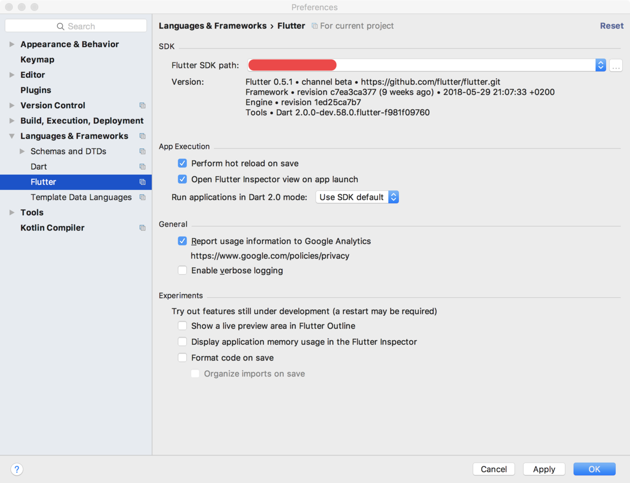 打开 AndroidStudio 可以直接填写在 Flutter SDK path 中,也可以在 AndroidStudio -> Setting -> Languages & Frameworks -> Flutter 中添加配置,如图: