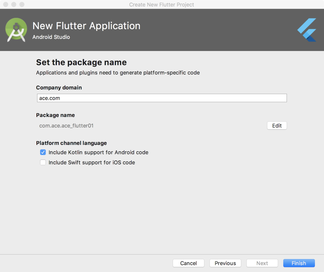继续进行下一步,填写公司名即包名,注意也只能是小写,这里可以选择支持 Kotlin/Swift,之后 finish,如图: