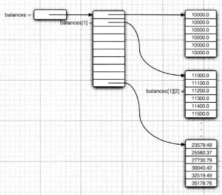 前面的利率表中,balances数组实际上是一个包含10个元素的数组,而每个元素又是一个由6个浮点数组成的数组。