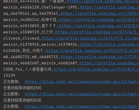 f.write(f"{name},{nickname},{userAvatar},{blogUrl},{blogExpert},{briefIntroduction}\n")