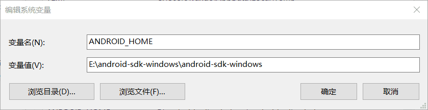 我的电脑 -> 系统属性 -> 环境变量 编辑用户变量 Path,将 ANDROID_HOME 添加进入,如图: