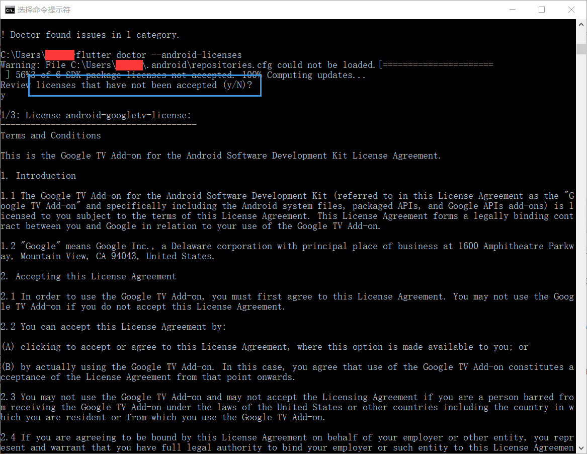 按照提示处理执行 flutter doctor --android-licenses,如图: