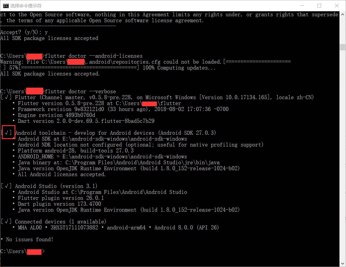 cmd -> flutter doctor --android-licenses 检测,提示 All SDK package licenses accepted. 所有的 SDK 都加载成功;cmd -> flutter doctor --verbose 检测所有的都是[√],如图: