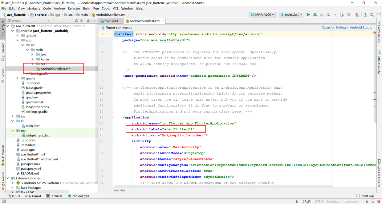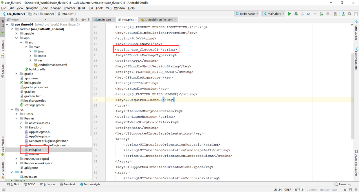 小菜找了好久,以为 Flutter 是跨平台应用,对应 Android 和 iOS 的 project name 是统一修改的,可是小菜我理解错了,应用名称是需要在 Android 和 iOS 中分别调整的;Android 是在 AndroidManifest.xml 中修改;iOS 则是在 Info.plist 中修改的;如图:
