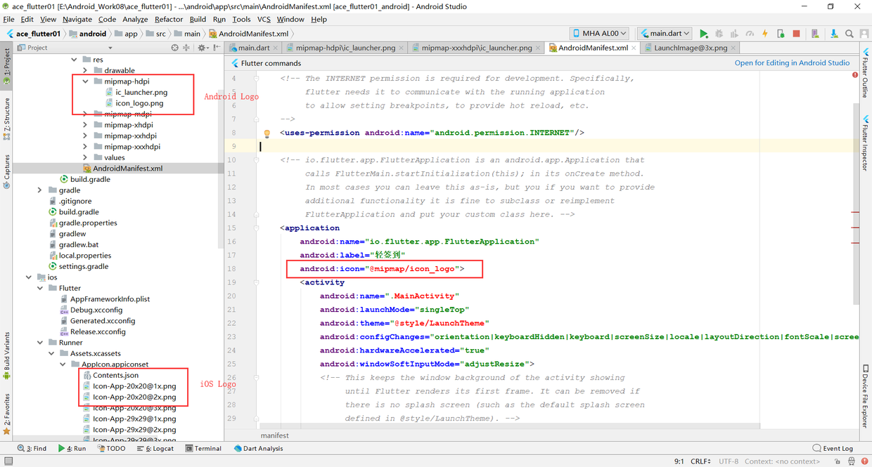同样的,如果需要更改应用的 Logo,同样是在 Android 和 iOS 中分别调整的;Android 是添加图片在 mipmap 文件夹中,并在 AndroidManifest.xml 中修改;iOS 则是在 AppIcon.appiconset 文件夹中添加对应 Logo 图标,并在 Contents.json 中进行配置,如图: