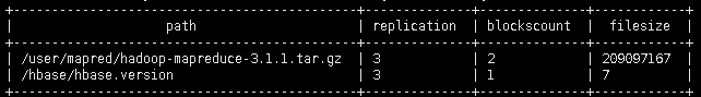 select path,replication,blockscount,filesize from fsimage_view where replication != 0 limit 2;