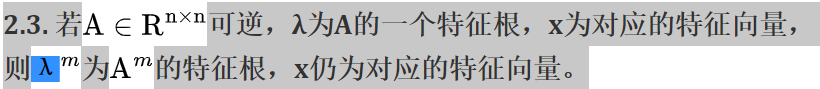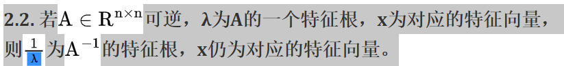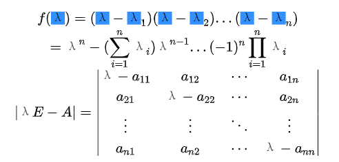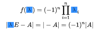 【摘要】 1. 矩阵特征值的定义Ax=λx等价于(λE-A)x=0。它是n个n元一次齐次方程组,它有非零解的充要条件是系数行列式|λE-A|=0。2. 矩阵特征值的性质证:因为是方程f(λ)=|A-λE|=0的解。所以只有分项会形成项,其系数为所以当λ=0时,所以证:得证。证:得证。证:所以与|λE-A|=0有相同的解。参考文献1.https://baike.baidu.com/item/%E7%9F...