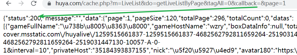 first_url = 'https://www.huya.com/cache.php?m=LiveList&do=getLiveListByPage&tagAll=0&callback=&page=1'