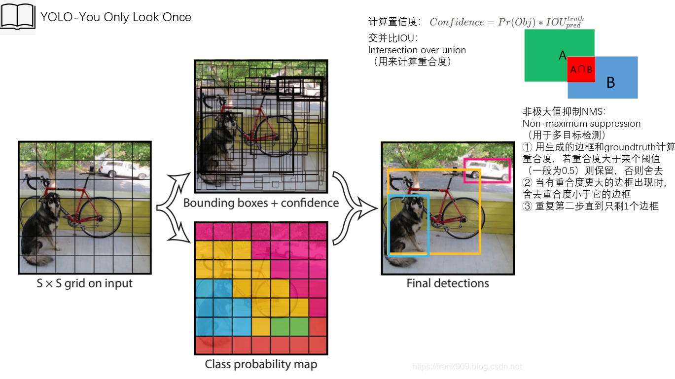 1. 首先,将图像分割为若干个网格(grid cell),每个网格负责生成3个包围框(bounding box),以及对应置信度。