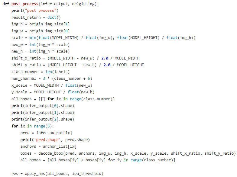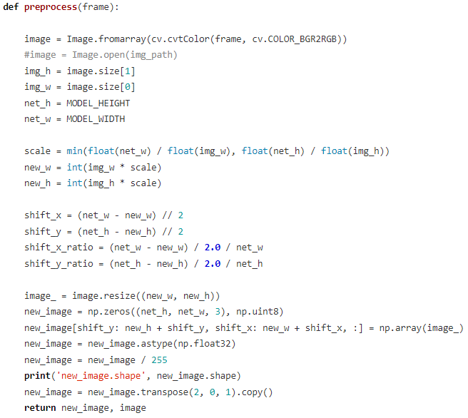 在预处理阶段,主要将opencv读到的图像转换成符合模型输入标准格式和尺寸的图像(源码如下图所示,完整版代码请查看文末链接)。