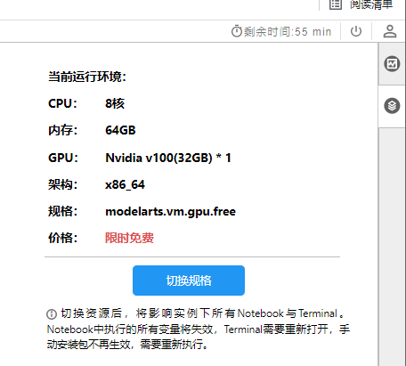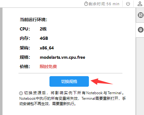 点击切换规格按钮,选择限时免费规格GPU,点击切换规格即可