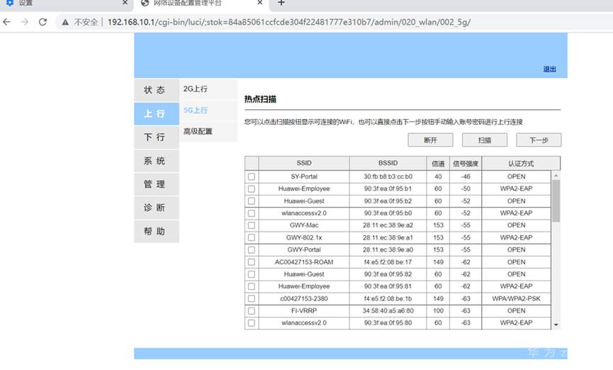 5G点击“上行”->“5G上行”,扫描SSID,点击选中然后下一步关联