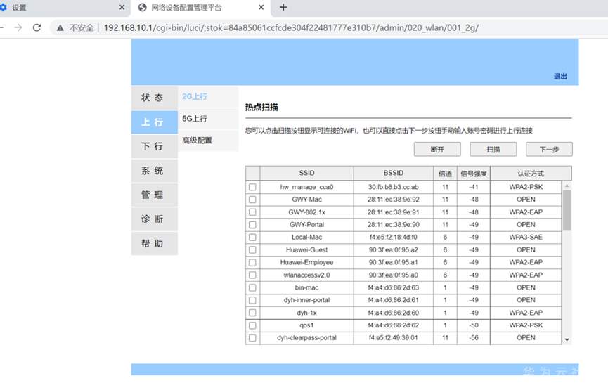 2.4G点击“上行”->“2G上行”,扫描SSID,点击选中然后下一步关联