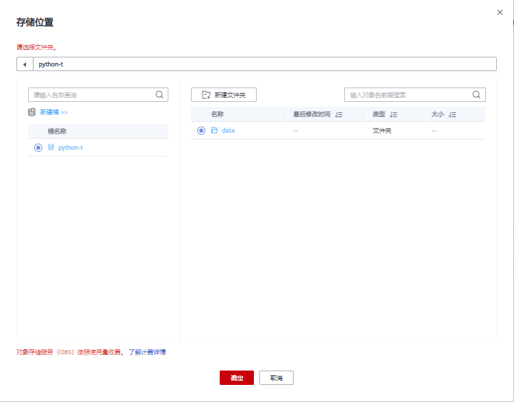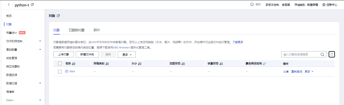 创建完成回到对象存储服务列表,点击刚刚创建的OBS桶名称进入详情页,选择左侧“对象”->“新建文件夹”(存放后续步骤的数据文件)。