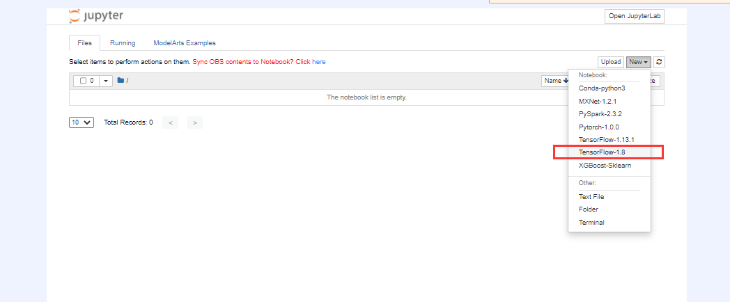 点击“打开”按钮进入Notebook。点击“New” ->”TensorFlow-1.8”创建 Notebook Python开发环境。如下图所示: