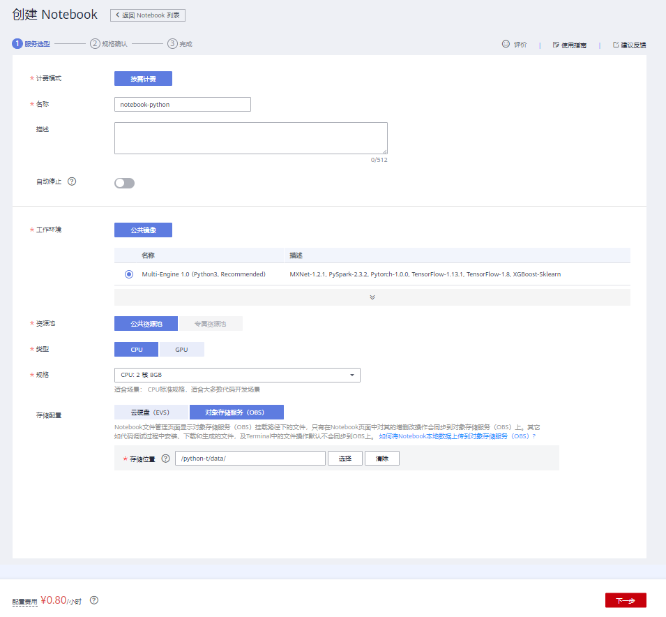 参数填写完毕后,点击“下一步”,查看Notebook实例预览信息,确认无误后点击“提交”。