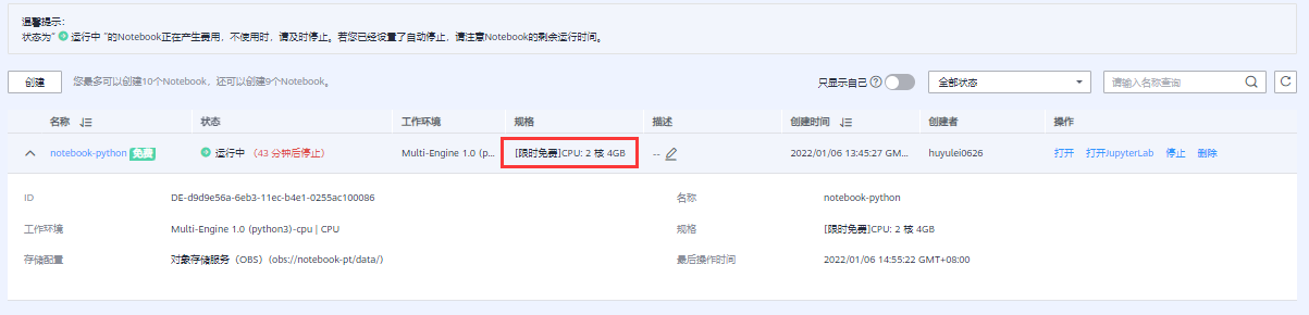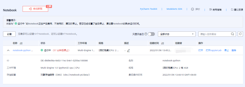 创建任务提交成功,点击页面的“返回Notebook列表”,返回Notebook列表页,等待Notebook创建成功,创建成功后状态会变成“运行中”,如下图所示: