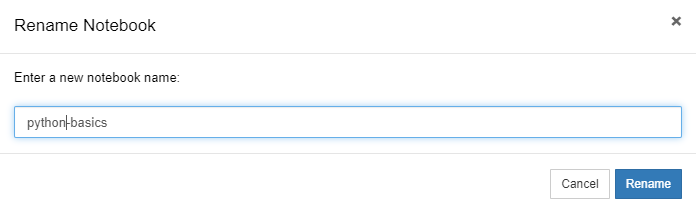 重命名刚刚创建的Notebook Python开发环境。点击“Untitled”,名称为:python-basics,然后点击“Rename”按钮,如下图所示:
