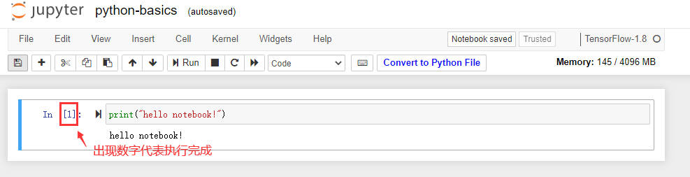 打印一行字符串,按Shift+Enter(该组合键是Notebook中执行代码的快捷键)或者点击下图“Run”