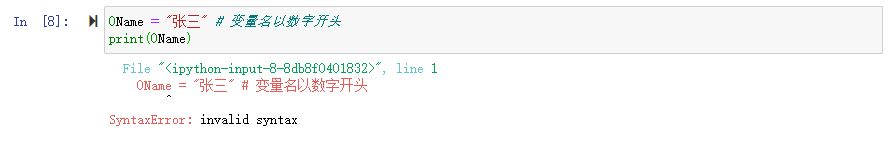 0Name = "张三" # 变量名以数字开头