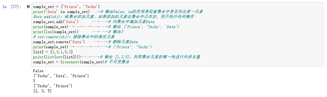 print('Data' in sample_set) # 输出False,in的作用是检查集合中是否存在某一元素