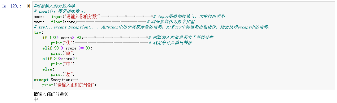 if 100>=score>=90: # 判断输入的值是否大于等级分数