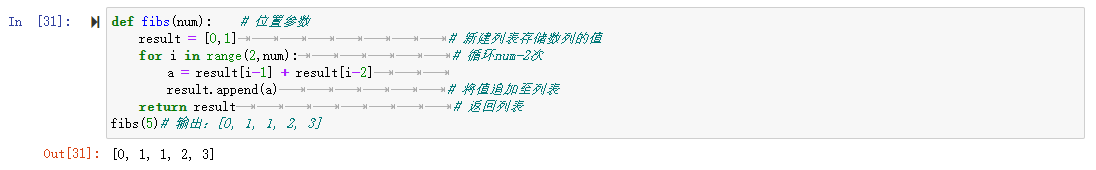 fibs(5)# 输出:[0, 1, 1, 2, 3]