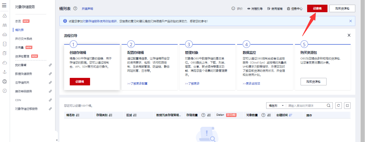 登录华为云平台,点击“控制台”->“服务列表”-> 选择“存储”的“对象存储服务 OBS”,进入对象存储页面后,右上角点击“创建桶”。