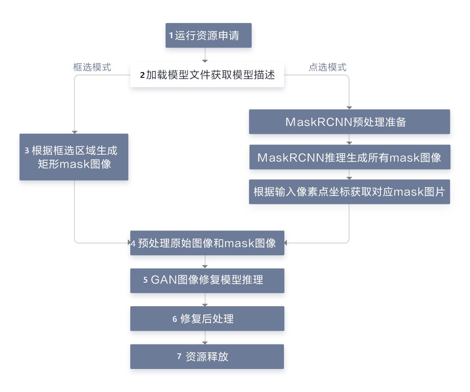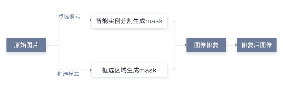 无论哪种模式,需要对相应区域进行图片修复,使整体看上去自然美观,因此整体逻辑结构如下所示: