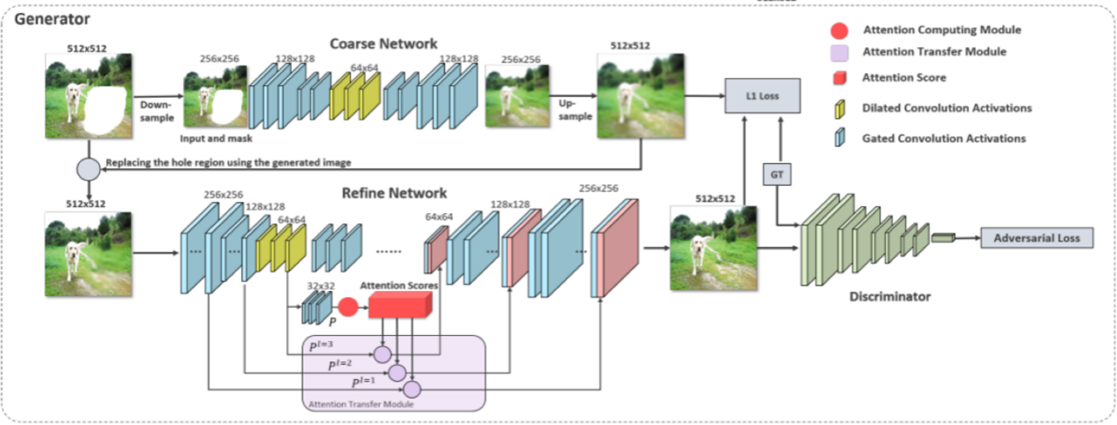基于GAN模型的修复框架包括粗(Coarse network)和精(Refine network)两个自编码器网络架构。