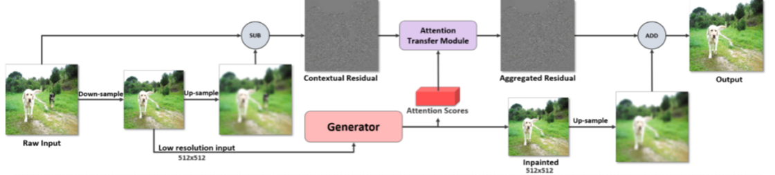 Qiang Tang等人提出借助CRA算法(Contextual Residual Aggregation for Ultra High-Resolution Image Inpainting )实现高清修复。首先由GAN的生成器得到低分辨率的修复好的图像,然后通过残差聚合模块先得到高频残差即图片的细节,再对图片修复区域的细节进行增强,最后将增强的细节叠加到生成器输出的图片的修复区域得到高清修复的图像,最终的效果也相当惊艳。