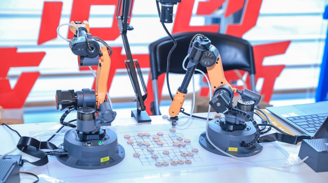 除此之外,展示中小巧灵活的机械臂有没有让你眼前一亮的感觉?项目中采用的是开塔米罗研发的的桌面级六轴机械臂,主要面向的是K12教育,其有效范围内精度可达0.2mm。结合厂商提供的API接口,研发团队对控制流程精心设计并且进行了优化,控制气泵开关来让吸盘提子落子,结合棋盘理解模块信息作为反馈,采用棋子的真实坐标,让机械臂“睁着眼睛”操作棋子,进一步减小了定位误差。