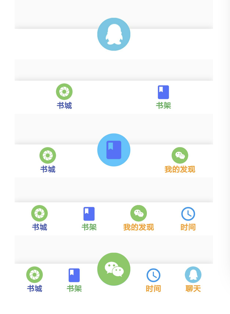 小菜补充一种中间位凸出样式,item 总数为奇数时中间位才会凸出,而偶数时不会凸出,默认其他 item 为普通 nomal 样式,支持图片或 icon 以及文字变色等效果。
