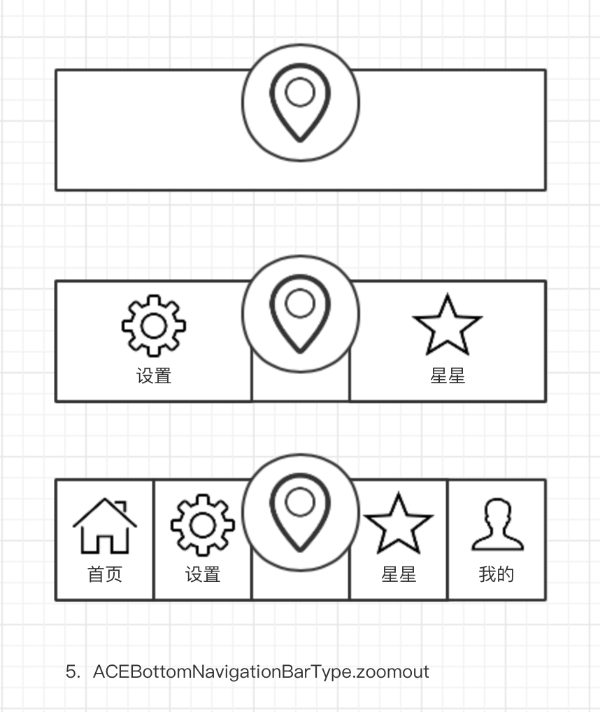 小菜在前几种类型中配置效果主要是在 NavigationItem 中实现的,而固定凸出位样式只有在中间显示,所以小菜准备在 ACEBottomNavigationBar 中进行配置,优先判断 item 总数,再将中间位凸出展示。其中小菜偷个懒,因为只有在中间位展示,所以在向子 NavigationItem 传 type 类型是传递的是 nomel 类型,只需判断中间位是否展示即可。