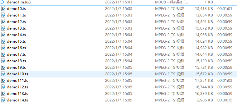 由于上述命令转码之后,生成的文件名如下所示,所以需要修改视频切片的名称生成规则,新增如下参数 -hls_segment_filename video%07d.ts 。