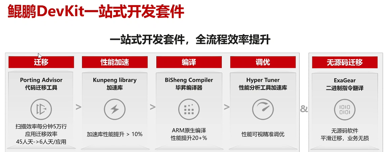 通过以上分析,ARM架构可以说是趋势之一,但应用从X86架构转为ARM架构还是存在以上问题。故华为鲲鹏基于鲲鹏生态开发了鲲鹏开发套件(详细见下图)。