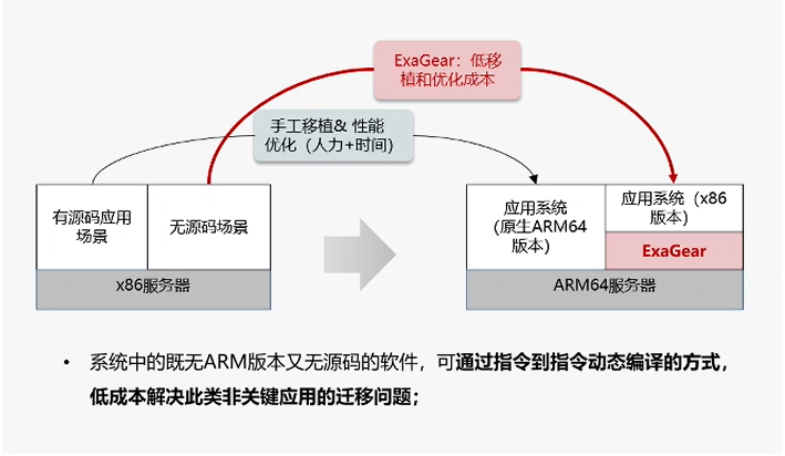 华为动态二进制翻译工具(ExaGear):ExaGear是华为自研动态二进制翻译工具,通过在运行时,将x86应用指令翻译为ARM64指令并执行,从而支持Linux x86应用无需重新编译就能运行在ARM64服务器上,帮助客户将Linux x86无源码应用快速迁移到ARM服务器上,且能稳定可靠运行。