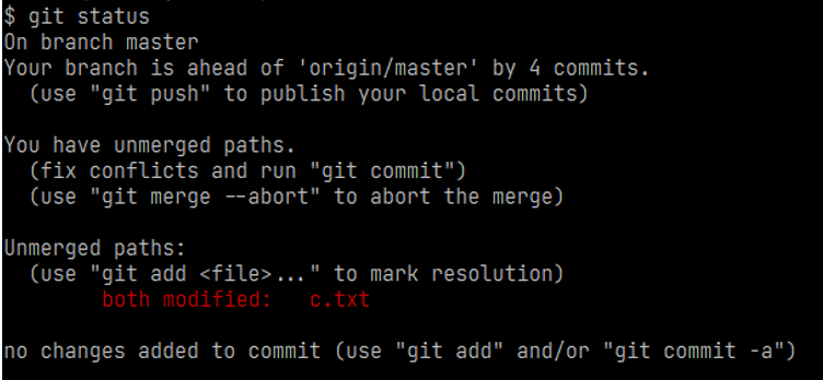 使用git status查看状态,并看到分支处已变为(master|MERGING),表示当前停在此正在合并的状态,根据提示使用git add c.txt进行文件修改后提交。