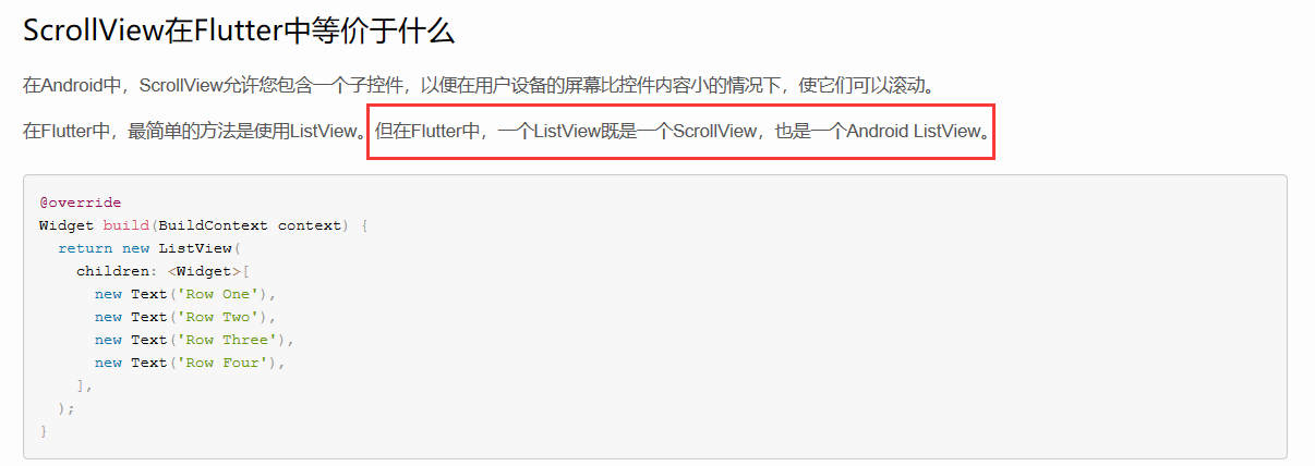 小菜查了一下官网,调整方式很简单,将根 widget 调整为 body: new ListView(),Flutter 中的 ListView 不仅代表列表 (ListView/RecycleView),还可以代表一个可滑动布局 (ScrollView),如图: