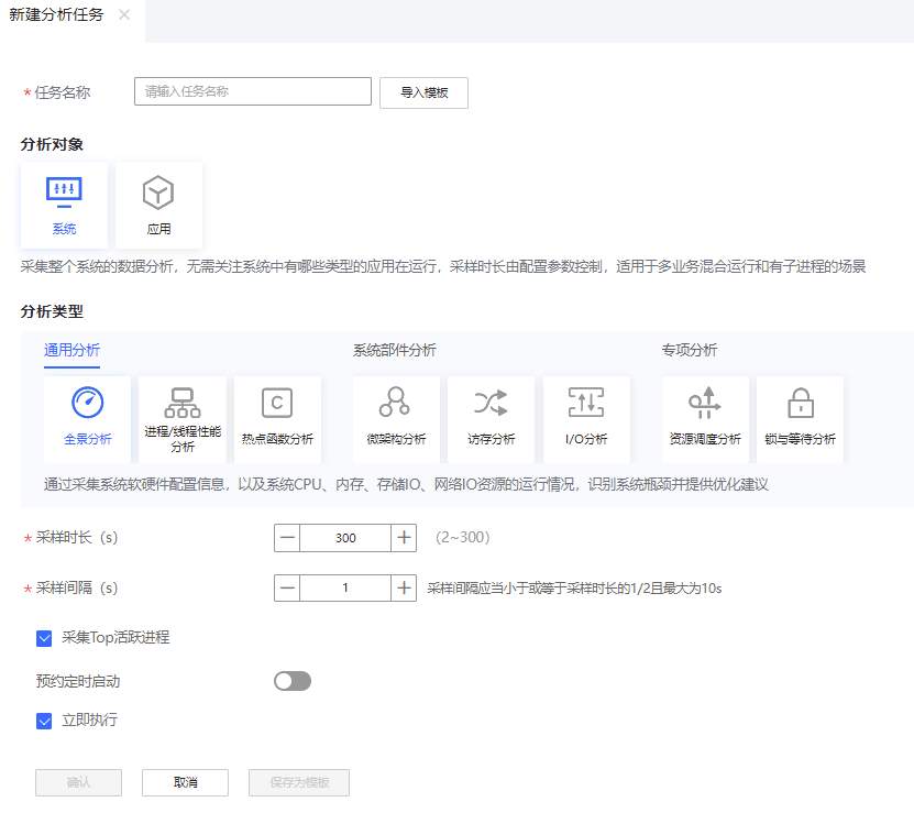 调优助手大大简化了工程、任务、分析等操作的步骤,原先需要多次录入、多个步骤进行的操作,在调优助手里可能只需要很简单的操作就可以了,以新建分析任务为例,系统性能分析模块是这样的: