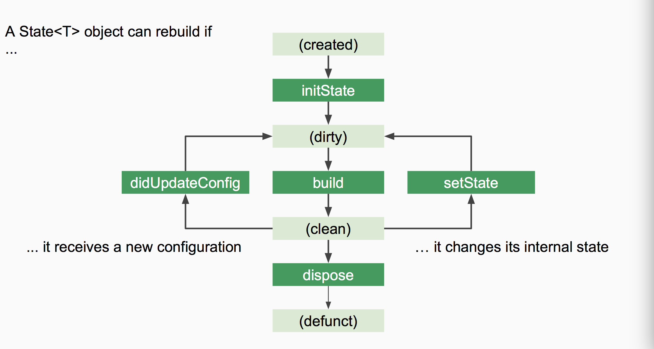 - dispose 用于 Widget 被销毁时,通常会在此方法中移除监听或清理数据等,整个生命周期只会执行一次;