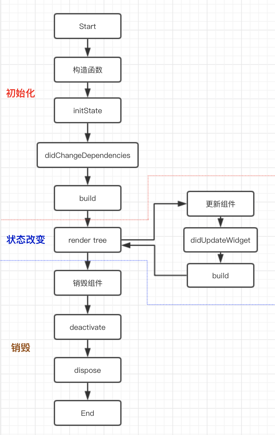 - didUpdateWidget 当 Widget 状态发生改变时调用;实际上每次更新状态时,Flutter 会创建一个新的 Widget,并在该函数中进行新旧 Widget 对比;一般调用该方法之后会调用 build;