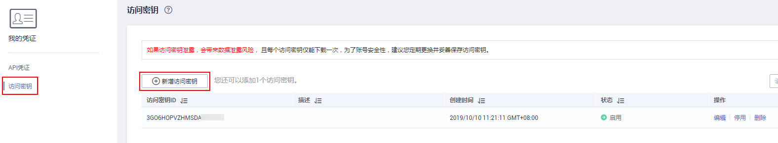 - 登录华为云,进入控制台,点击用户名下“我的凭证”,点击访问秘钥,进入秘钥管理界面,点击新建访问秘钥。