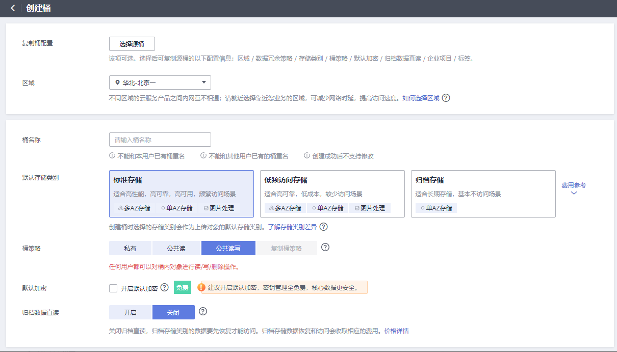 - 参数配置: 存储策略:标准存储; 桶策略:公共读写; 其余参数可自定义输入。