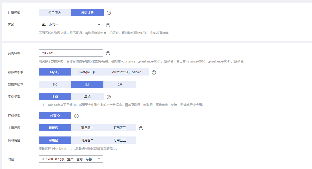 - 参数配置: 计费模式,数据库引擎,数据库版本,实例类型,规格参数等根据个人需求进行选择;