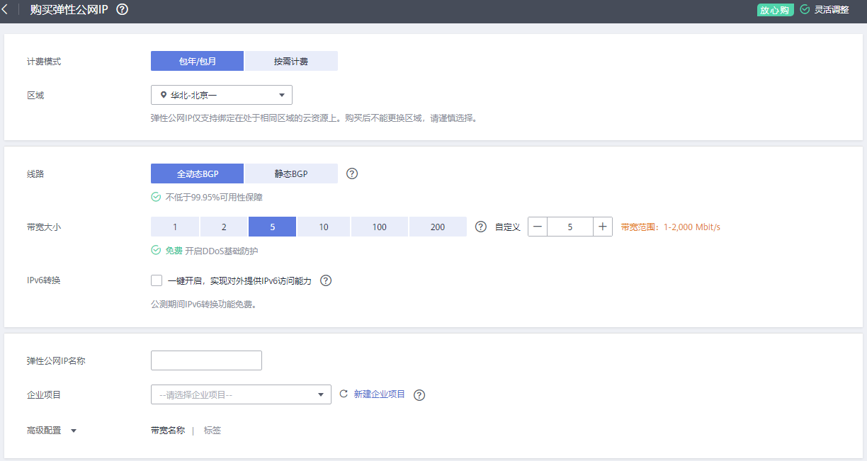 - 登录华为云,进入控制台,进入EIP管理界面,点击“购买弹性公网IP”,进入创建界面。