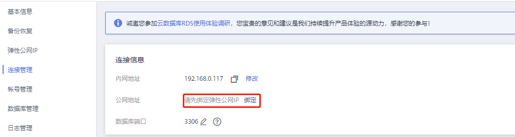 - 数据库配置公网IP,进入数据库详情界面,点击“连接管理”,进入连接管理控制台,点击“绑定”按钮,选择新建的EIP;