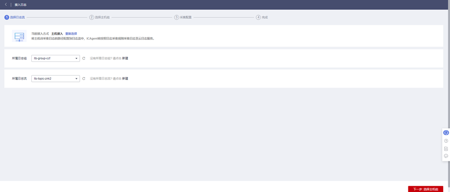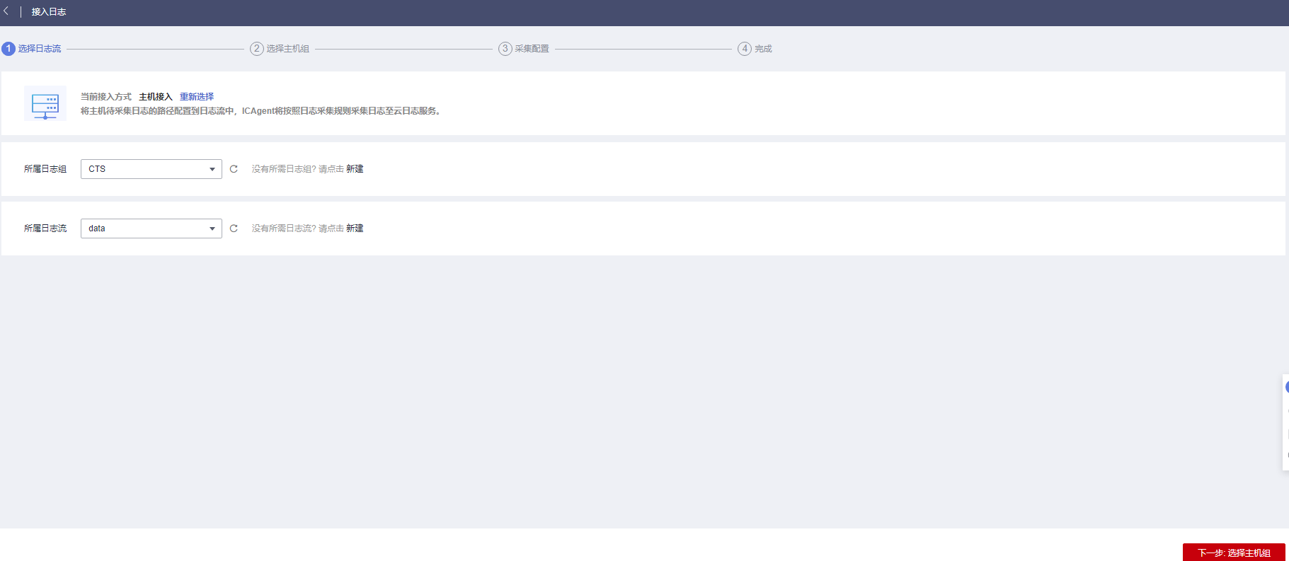- LTS-step1 选择日志组以及日志流 (若不存在主机组以及日志流,点击新建即可)