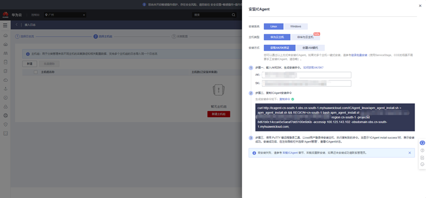 - 登录华为云,进入控制台,进入LTS管理界面,进入“日志接入”模块,点击“接入日志”按钮选择主机接入,进入配置界面。
