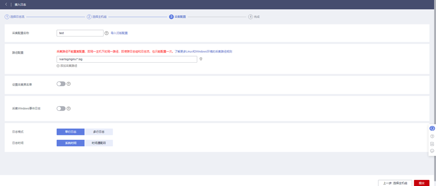 - LTS-step3 日志采集配置,当前采集nginx 日志为例,配置完成点击提交即可